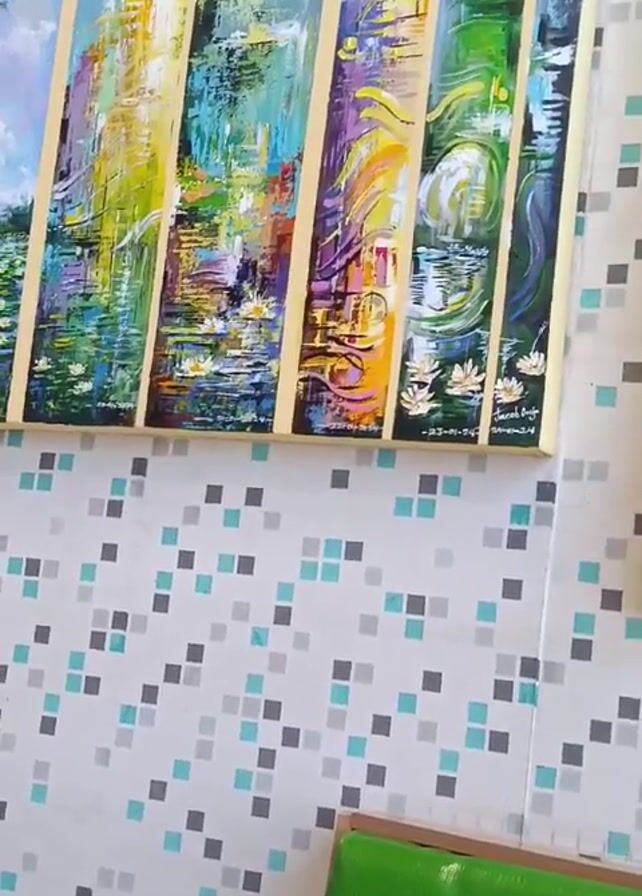 wall with a tiled pattern of white, light blue, and gray squares, upon which hangs an abstract painting. The painting is divided into six vertical panels, each depicting a watery scene with lily pads in a variety of colors including green, blue, yellow, purple, and white. At the bottom of one of the panels, there is a signature. A corner of a green chair is visible in the lower right of the frame. The camera is stable.