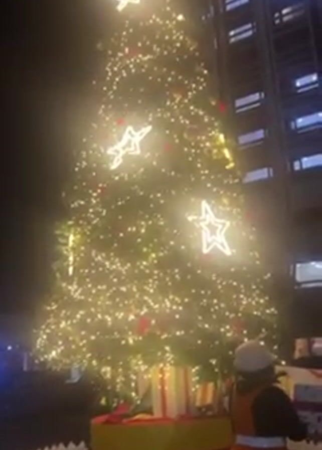 large Christmas tree, adorned with numerous yellow lights and large star decorations, standing outside at night. The tree is surrounded by wrapped gift boxes and a white picket fence. The camera moves slightly, and people are visible near the tree. One person wearing an orange jumpsuit and a hat is standing next to a table also covered in wrapped gifts. A tall building is visible in the background.