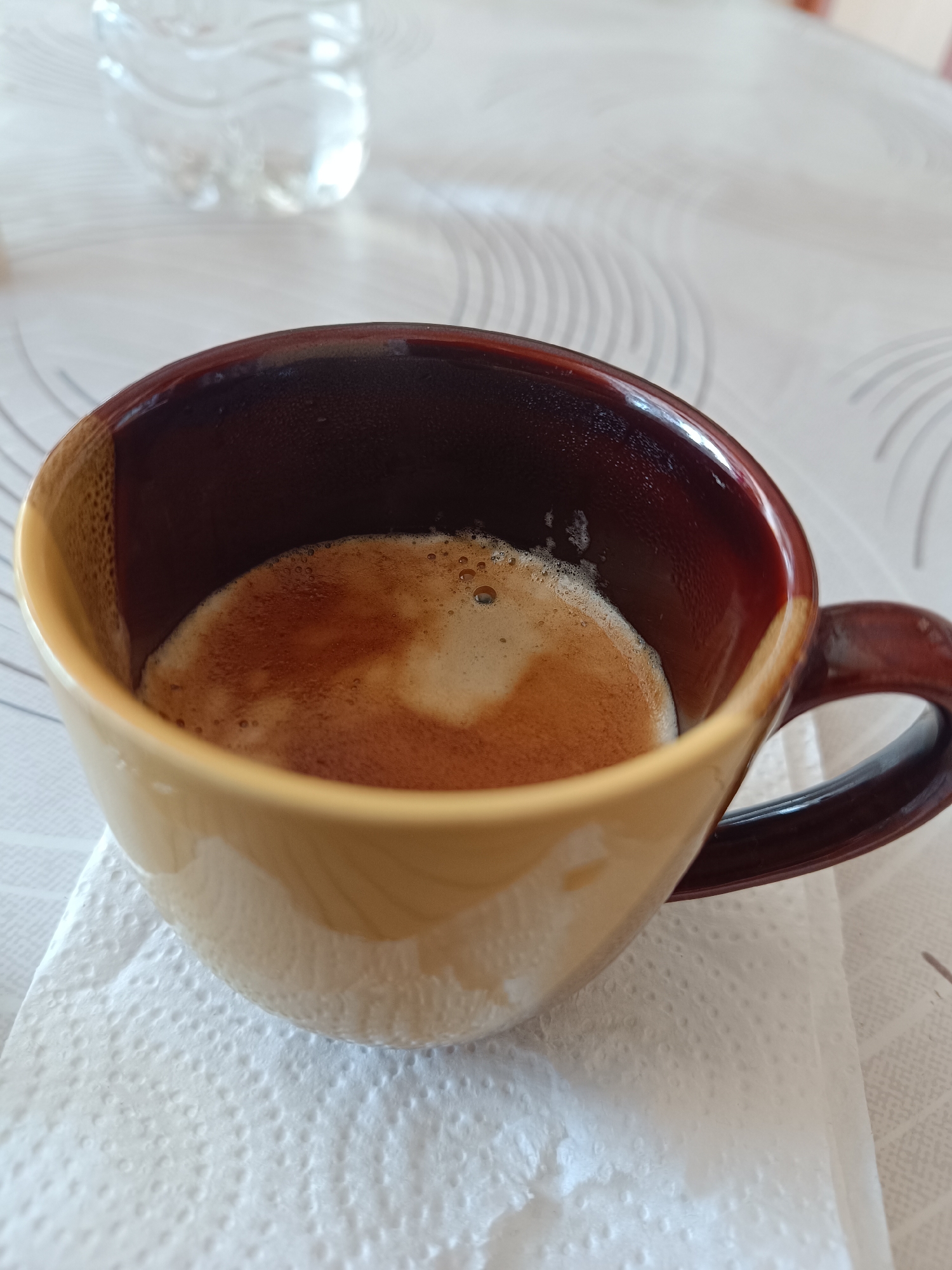 A two-toned ceramic mug, beige on the exterior and dark brown on the interior and handle, contains espresso coffee with a light brown crema and small bubbles. Condensation is visible on the inner wall of the mug above the coffee line. The mug rests on a white, dimpled paper napkin, which is placed on a light-colored table with a subtle, light grey swirling pattern. A clear plastic water bottle is partially visible and out of focus in the upper background. No individuals are present. The scene is located in Shumen, Bulgaria.