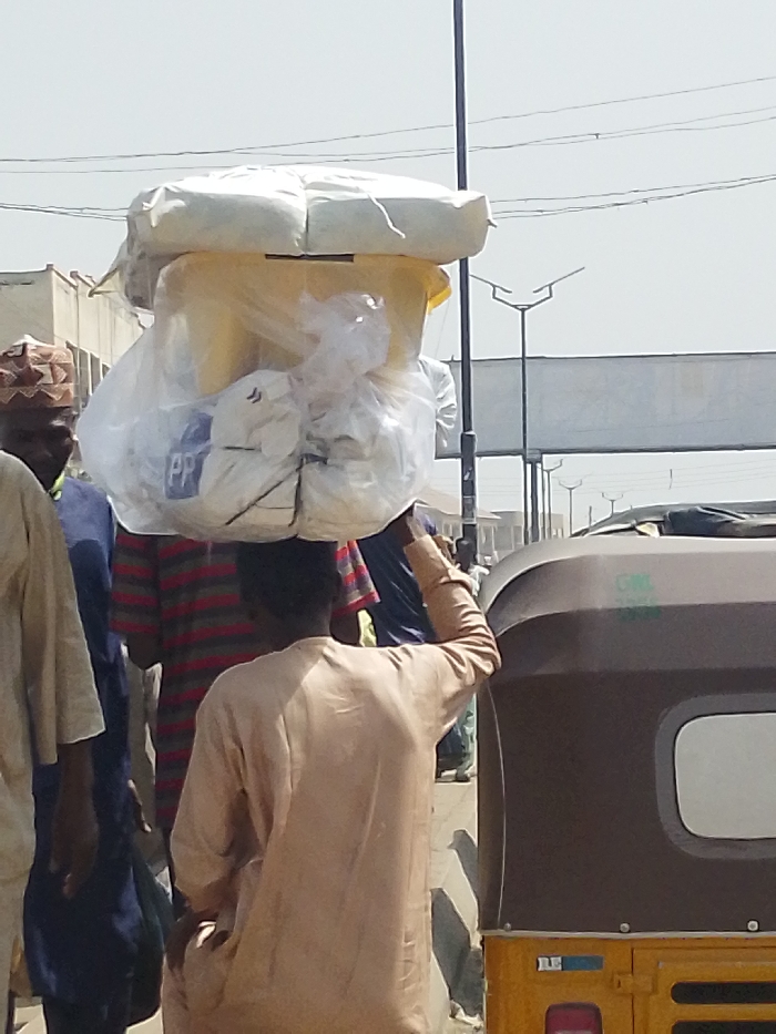 The image depicts a bright, sunlit outdoor scene in Fagge D1, Nigeria, showing a street or market environment. In the foreground, a person, viewed from behind, wears a light tan long-sleeved garment and carries a substantial, multi-component load on their head. The load consists of a large, light-colored bundled item atop a yellow container, further wrapped and supplemented with clear plastic bags containing white and light-colored materials, one bag showing the letters "PP". The individual's right arm is raised, with the hand near the load, possibly steadying it. To the immediate left of the central figure, a man with dark skin is partially visible, wearing a brown patterned cap and a blue over-garment. Further left, another person wears a red and dark-striped shirt. To the right, the rear upper section of a brown and yellow three-wheeled vehicle, consistent with an auto-rickshaw, is visible, showing a small window and a green logo on its brown canopy. The background features a clear, pale sky with overhead power lines. A tall, dark pole stands vertically near the center. A series of modern streetlights with distinctive upward-angled luminaires extends into the distance along what appears to be a road. Light-colored buildings are visible in the far left background, and a large, rectangular structure, possibly a billboard, is present in the distant background. The ground surface is indistinct but suggests a paved or dirt road.