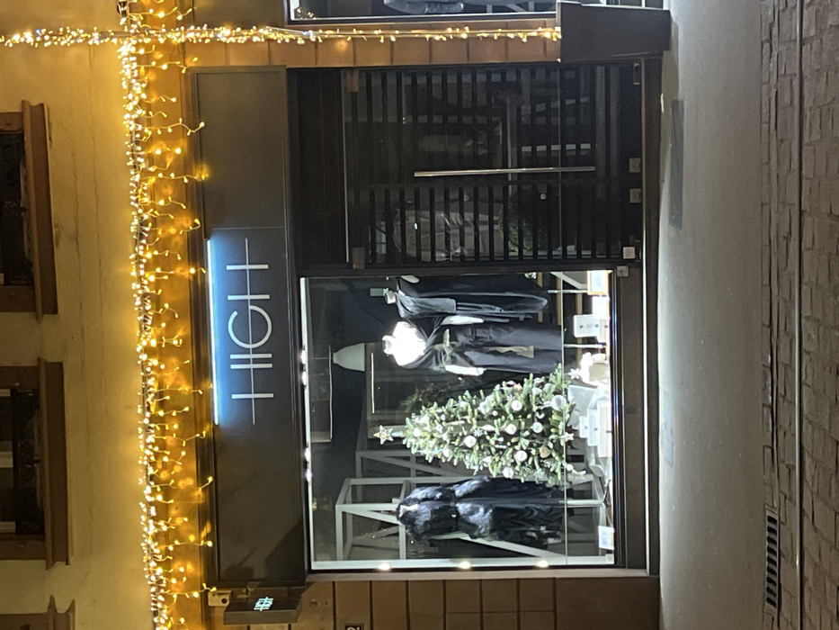 A storefront display with a "HIGH" sign illuminated vertically in white. A Christmas tree with ornaments is inside. Mannequins wear dark clothing behind the tree. The storefront is decorated with warm white string lights. The building exterior appears to be aged with traditional window details. The storefront is dark, possibly closed for the night.