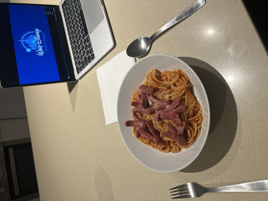 A plate of spaghetti topped with sliced sausages and grated cheese sits on a beige countertop. A laptop displays the Walt Disney Pictures logo next to the plate. A spoon rests above a white napkin near the laptop. A fork is positioned below the plate. An oven and cabinets are visible in the background. The scene suggests a meal being enjoyed while watching a movie on a laptop.