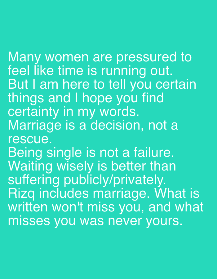 A teal background displays a message in white text offering reassurance to women. The message addresses the pressure to marry, asserting that marriage is a choice, not a rescue, and that being single is not a failure. It advises to wait wisely rather than suffer. The message concludes with the concept of "Rizq" including marriage, and the saying, "What is written won't miss you, and what misses you was never yours."
