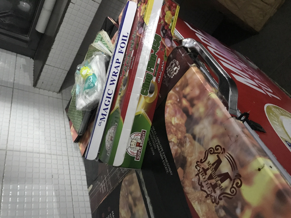 The scene depicts an interior view of a commercial area, likely a kitchen or storage space, situated at KM 42, Lekki Expressway, opposite Para Park Estate, Lekki, Nigeria. In the foreground, a dark countertop holds several stacked items. Prominently visible are a white box labeled "CIL MAGIC WRAP FOIL" and a green and red box marked "SUPER BRIGHT Cling Film 450." Behind these, a stack of items, some wrapped in clear plastic, is present. Text on a dark surface beneath the stacked boxes provides the specific location details: "KM 42, LEKKI EXPRESSWAY, OPPOSITE PARA PARK ESTATE, ANGOOTEDO." Partially visible below the countertop is a red object, likely a cooler or delivery box, featuring a metallic handle and partial white lettering. Resting on this red object is a decorative brown and cream-colored panel, possibly a box lid, which displays the "MAMBILLAH HOTELS" logo and an image of food. A small black strap is visible near this panel. The background features a white tiled wall with small square tiles and a dark-framed window or opening on the right side. No individuals are present in the image.