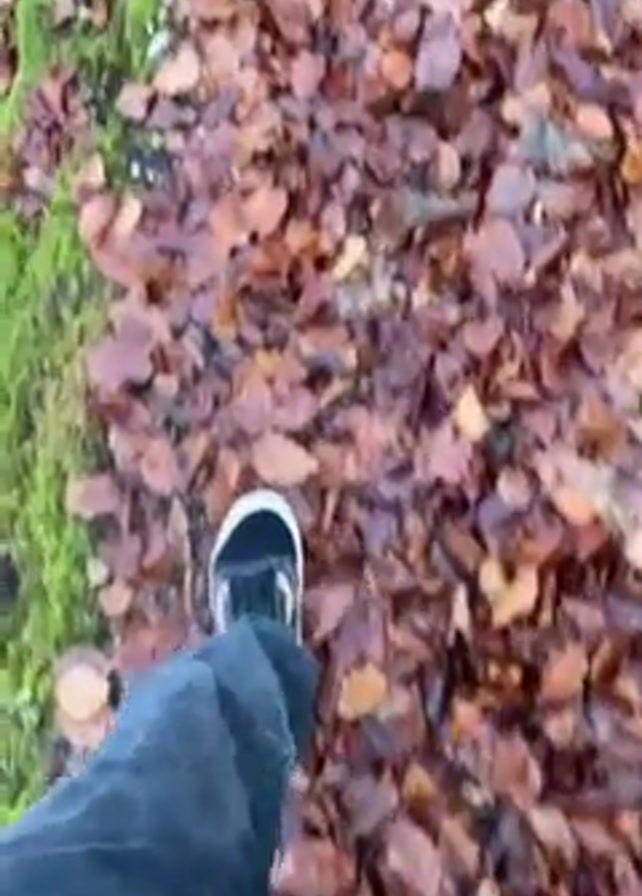 A person wearing dark jeans and black-and-white sneakers walks over fallen brown leaves on a path. Moss grows to the side of the path. The scene is shot from a low, first-person perspective.