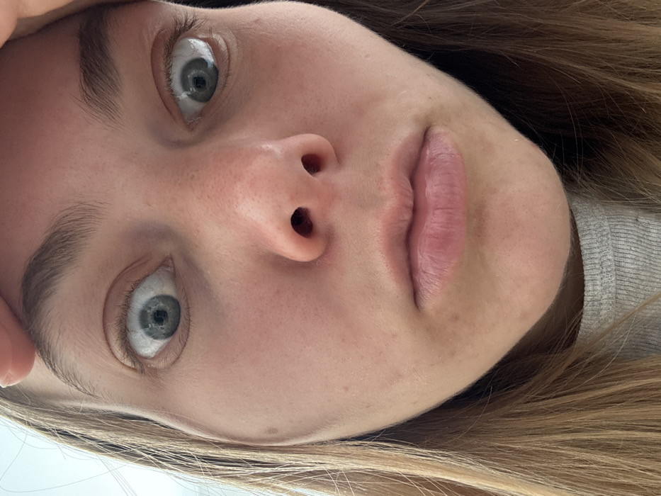 A close-up shot of a woman's face, angled downwards. Her eyes are wide and appear gray-green. Her skin is fair with freckles around the nose and cheeks. Her eyebrows are light brown and natural. Her lips are full, with a pink hue. Part of a gray sweater is visible on the right side, and strands of light brown hair frame her face. The overall lighting is bright and natural.