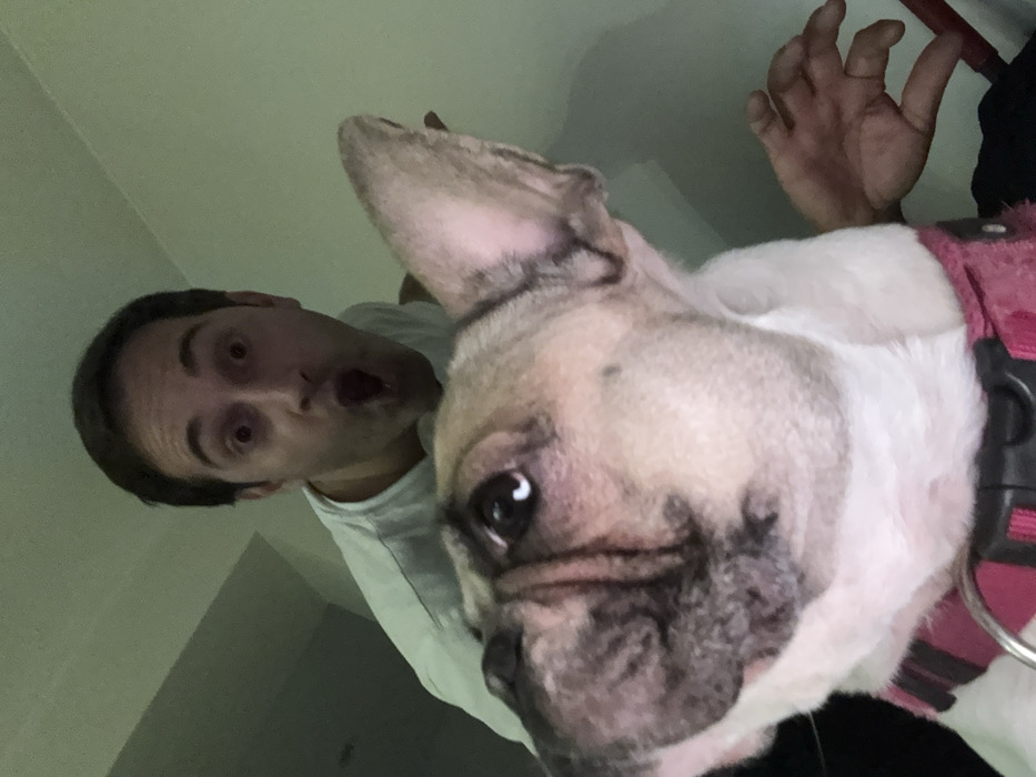 A man and a dog are in close proximity. The man, with wide eyes and an open mouth, appears surprised or shocked. Next to him, a brindle and white French Bulldog gazes at the camera. The dog wears a pink harness with black accents. An outstretched human hand is visible in the background, possibly belonging to another person. The shot is taken from an odd angle, looking upwards at the subjects.