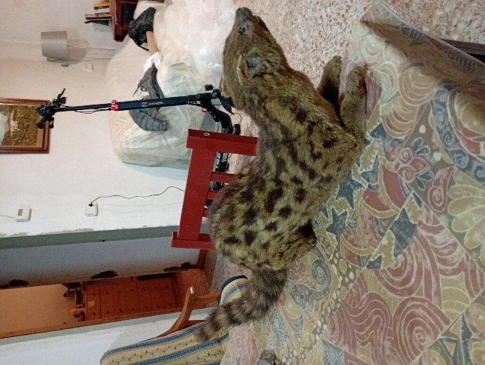 A mounted genet stretches upward on a patterned table or tablecloth. Its tan fur is marked with dark spots and a ringed tail. Behind it is a red, wooden object and a scooter rests on a covered surface. A framed picture hangs on the wall above a cabinet. A striped chair is visible in the foreground. The room's decor is cluttered and eclectic.
