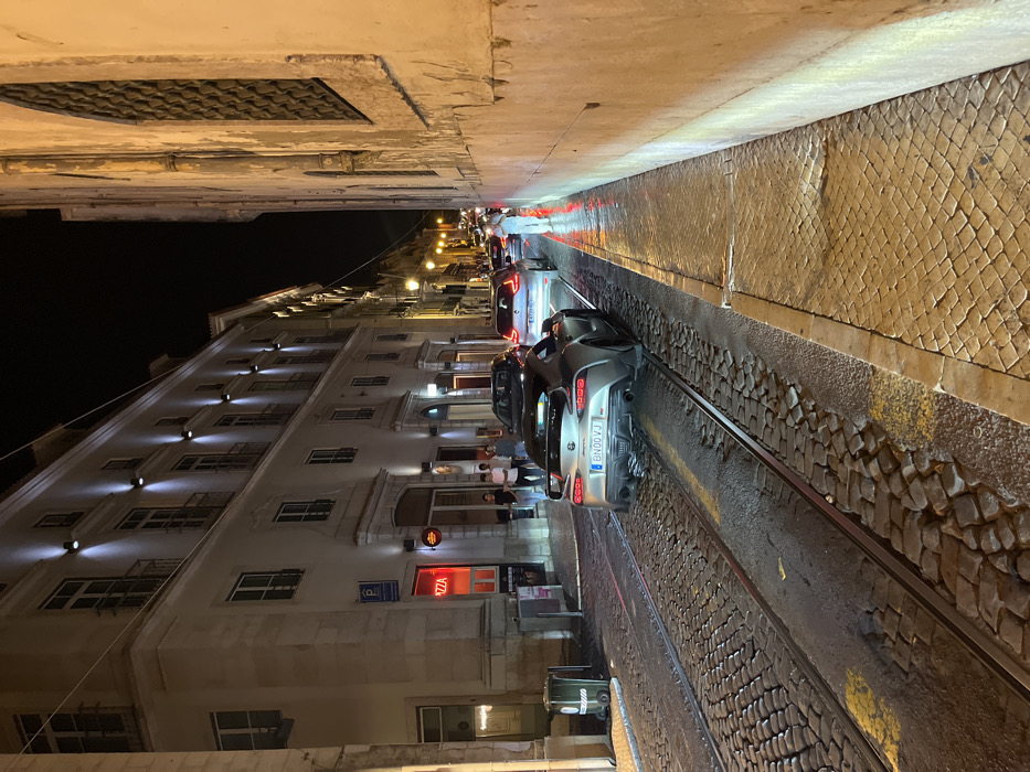 - "A night scene unfolds on a narrow, cobblestone street with tram tracks in the Baixa district of Lisbon, Portugal" by FM-XmQCg2, licensed under CC BY 4.0