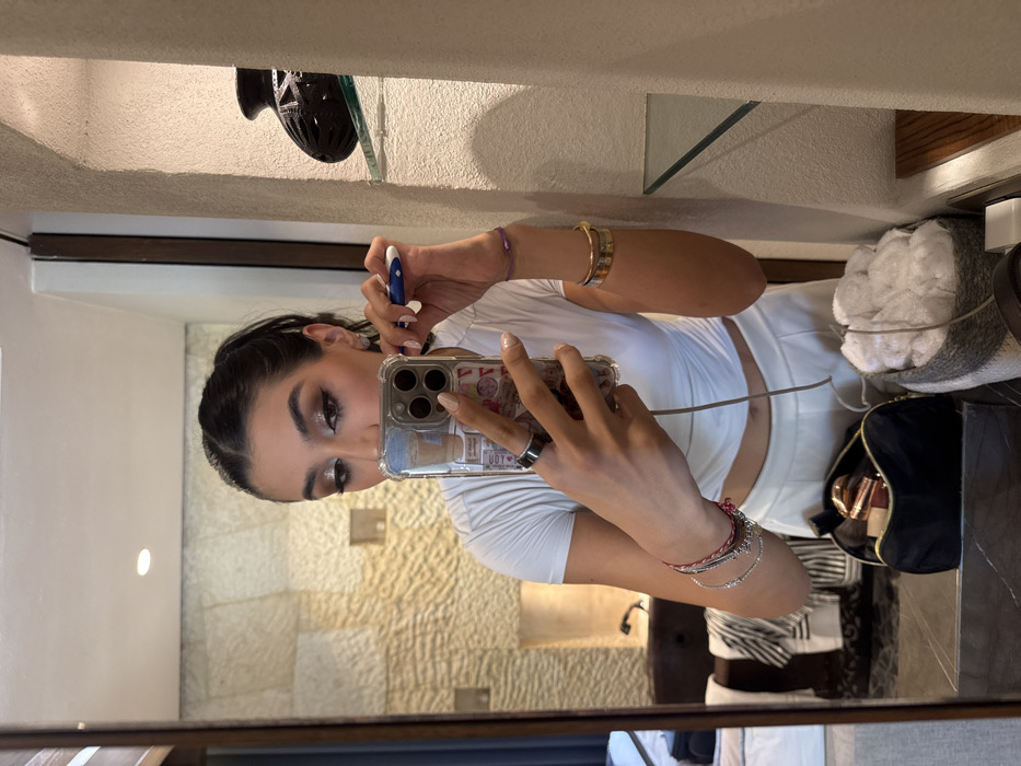 An adult female is depicted in a mirror reflection, taking a selfie inside a high-end hotel bathroom. The environment strongly resembles bathrooms found at Casa Antonieta in Oaxaca City, Mexico. The subject, visible from the chest up, has dark hair pulled back and wears a white cropped top and white pants. Her face features prominent makeup, including shimmery eyeshadow and winged eyeliner. She holds an iPhone, encased in clear plastic with stickers, with her left hand, partially obscuring her face. In her right hand, she holds a small blue and white object, positioned near her right ear. Her left wrist displays red string and silver chain bracelets, while her right wrist wears gold-colored bangles and a purple string bracelet. A dark ring is present on her left ring finger. The mirrored background reveals a textured, light-colored stone wall with integrated rectangular lighting recesses. To the right, an arched alcove with two glass shelves is visible; the top shelf contains a black decorative ceramic pot. A black zippered makeup bag filled with cosmetics and a woven basket holding white rolled towels are situated on the vanity counter. A bed with white linens is partially reflected in the far-left background, indicating a hotel room setting.
