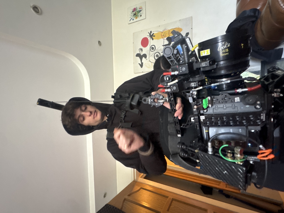 The scene is an interior, likely a residential or private dwelling, situated in Vincennes, France. A male subject, appearing young, with dark, curly hair, is centrally positioned. He wears a black hooded sweatshirt and a sophisticated black camera stabilization harness system, which includes a chest rig, shoulder straps, and a wide belt. A black pole extends vertically from the rear of the harness towards the ceiling. The subject is actively engaged with a professional-grade digital cinema camera setup, which is mounted on the stabilization system. The camera rig includes a large lens visibly marked "Cooke 4/i," a detailed body with numerous ports, cables (red, green, yellow), and mounting plates. The individual's right hand is elevated and blurred, suggesting an ongoing adjustment or interaction with a small component of the equipment. His left hand appears to be gripping or supporting a section of the camera rig. The immediate environment features light-colored walls. To the left, a wooden paneled door is partially visible. The ceiling is white, incorporating a curved architectural feature on the right side and recessed lighting fixtures. On the wall to the right, two framed pieces of abstract artwork are displayed; one is larger and features bold primary colors and black lines in a style reminiscent of abstract expressionism. A brown, upholstered furniture piece, likely a sofa or chair, is visible in the lower right corner.
