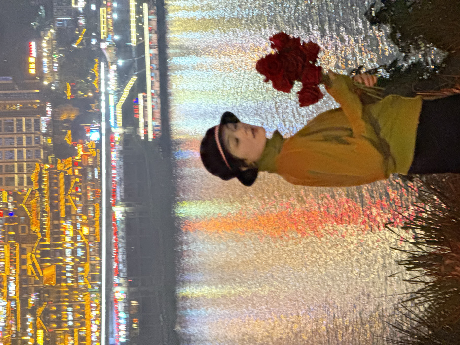 A solitary adult female stands in the foreground at night beside a river in 江北城街道, China. She wears a dark cloche hat with a light-colored band, an olive-green turtleneck sweater, and dark trousers. She holds a bouquet of approximately seven deep red roses in her left hand, positioned below her waist. Her head is slightly turned left, gazing past the camera. In the immediate foreground, dark green foliage is visible along the riverbank. The mid-ground is dominated by a wide body of water, likely a river, its surface extensively covered with vibrant, elongated reflections of city lights in yellow, orange, red, green, and white. In the background, across the river, a densely lit urban landscape features numerous buildings, some displaying traditional Chinese architectural elements with multiple tiered roofs, illuminated in golden and orange hues. Taller, modern structures are also visible. Several illuminated multi-deck vessels are discernible on the river, appearing to be moving or docked. The scene is brightly illuminated by artificial city lights and their strong reflections.