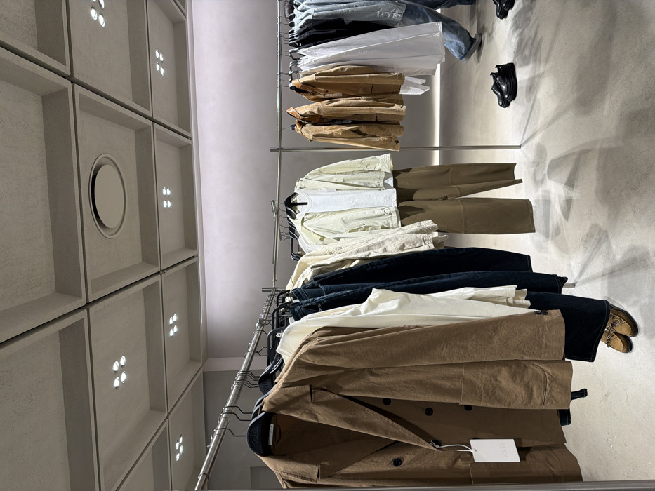 The scene depicts the interior of a retail clothing store, located in the Qinhuai District, China. The environment features a light gray, textured coffered ceiling composed of square panels, each containing either a recessed circular vent or a cluster of four square spotlights. The background wall is a solid, unadorned light beige or off-white. The floor is a smooth, light gray concrete or polished stone, reflecting ambient light and casting shadows. Two horizontal, silver-colored metal clothing racks are visible. The foreground rack, extending out of frame to the left, displays various adult garments on dark hangers, including a brown double-breasted blazer with a white rectangular ZARA brand tag, a white long-sleeve top, and dark blue denim trousers. Another ensemble, consisting of a light beige hooded jacket over a white t-shirt paired with beige trousers, hangs centrally on this rack. The second rack, positioned further back and to the right, holds additional apparel such as tan jackets, white shirts, and dark-colored garments. On the floor beneath the foreground rack, a pair of tan suede loafers are positioned. To the right, beneath the second rack, two pairs of black leather lace-up shoes are placed on the floor. In the far right background, the lower legs and feet of a person are partially visible, clad in light blue denim jeans and dark footwear, appearing to be in motion. No direct interactions between individuals are depicted.