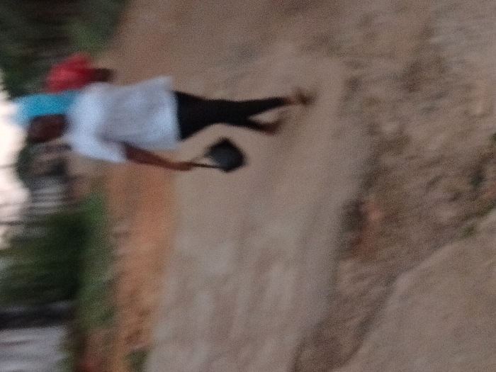 A person with a red hat and a white shirt walks on a dirt path. The person is also wearing black pants and holding a black object in their right hand. To the left is a blurred section with greenery. The right side of the image shows the path extending into the distance. The image appears blurry.