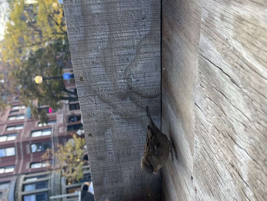 A house sparrow with brown and grey plumage stands on a light-colored wooden floor, positioned near a vertical barrier constructed from distressed light grey-brown wooden planks. The bird's head is slightly angled downwards and to the left. In the blurred background, multi-story red brick buildings with bay windows, characteristic of Boston, Massachusetts, United States, are visible. Autumnal trees with yellow-orange foliage, a street lamp, and indistinct human figures complete the urban scene, indicating an outdoor setting, likely a patio or pedestrian area in the city.