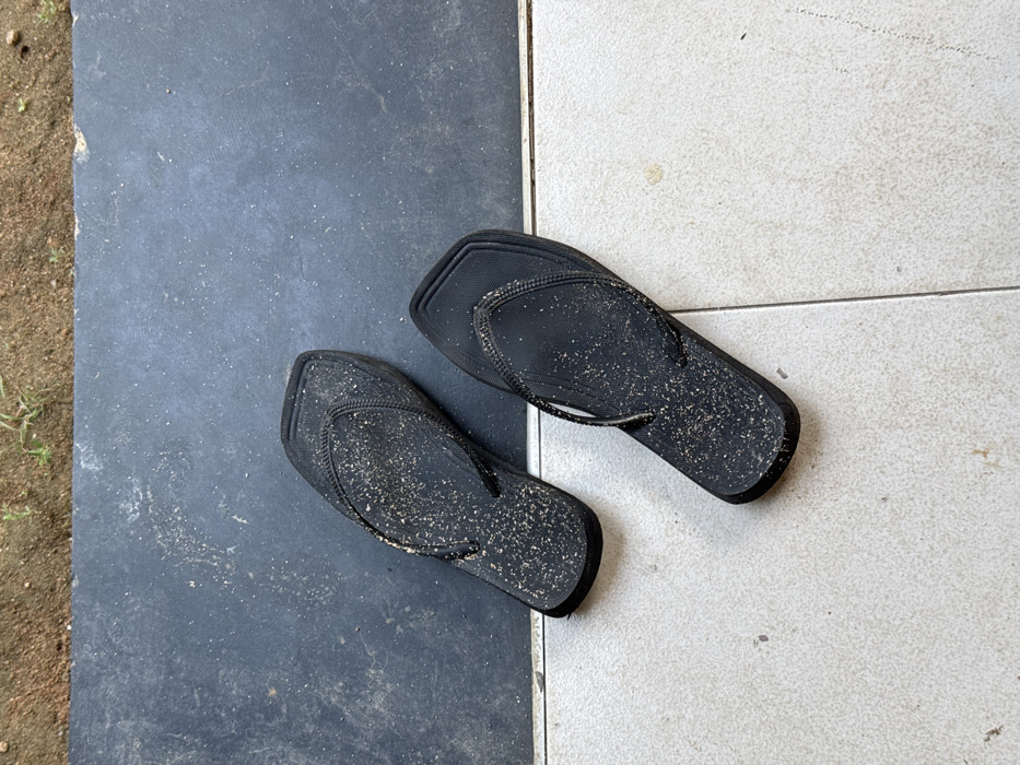 This image, captured in Mirissa, Sri Lanka, displays a static scene centered on footwear and floor surfaces