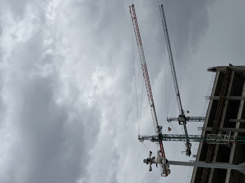 Two cranes rise against an overcast sky beside an unfinished concrete building with visible scaffolding. The cranes are different colors, one mostly white with some red markings and the other a darker green. A pole with cameras is visible in the foreground. The building is under construction, with exposed beams and rebar visible. The sky is predominantly gray with dense cloud cover.
