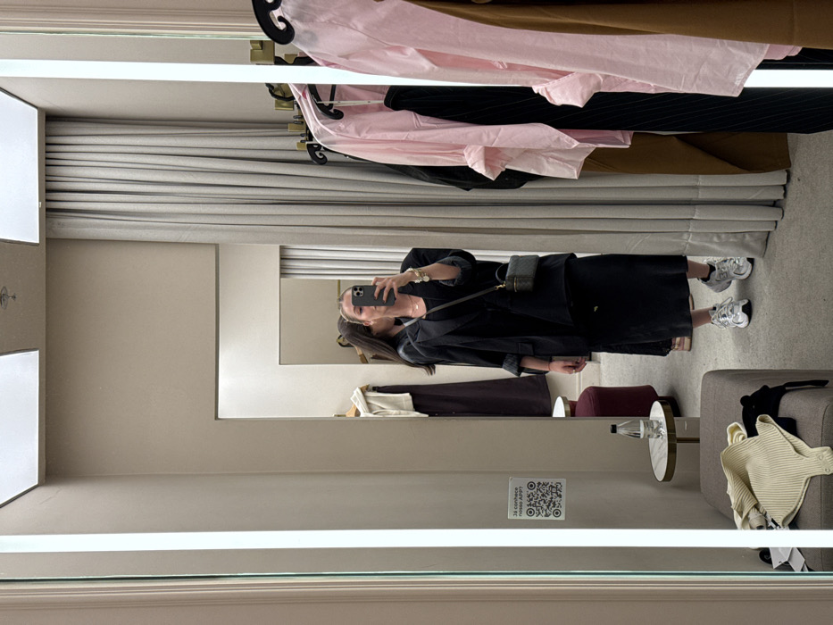 A female individual is visible taking a mirror selfie within a retail clothing store fitting room