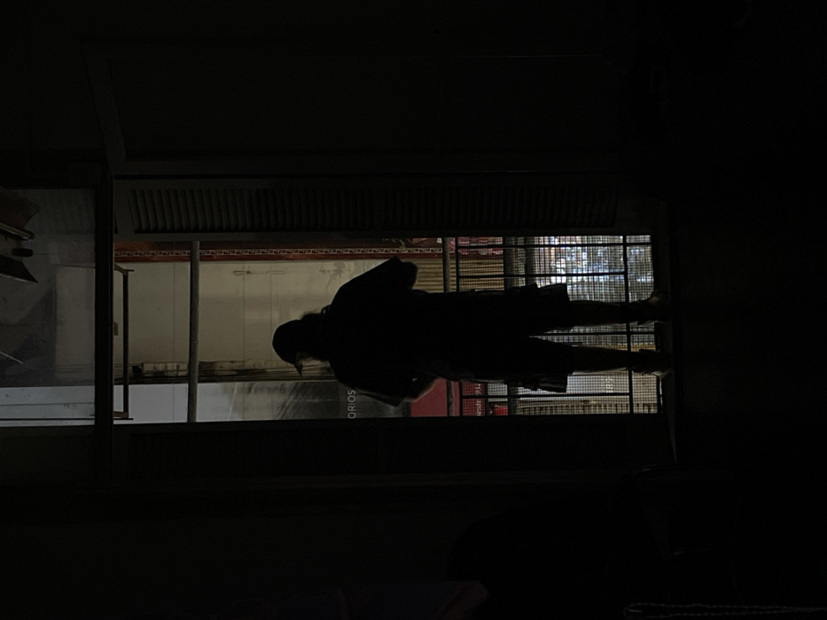 A silhouette of a person is seen through a window