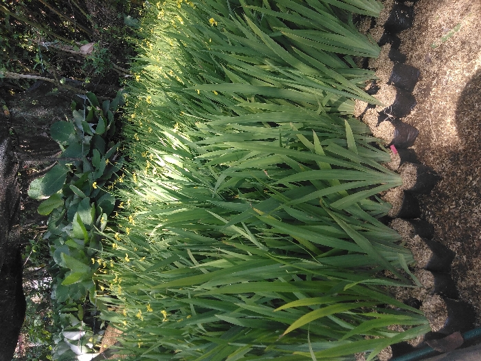This image depicts a plant nursery or garden area in Noria de Luis, Mexico. The foreground and midground are dominated by rows of numerous potted plants, each contained in a black plastic polybag or small pot. These plants feature long, erect, green, blade-like leaves, and many exhibit small yellow flowers on slender stalks extending above the foliage. The pots are arranged on dark soil or ground covered with light-colored organic material, possibly wood chips or mulch. In the background, larger, broad-leafed green plants are visible, and a dark mesh or shade cloth structure is partially visible overhead on the left, suggesting a controlled growing environment. Natural sunlight illuminates the scene, casting shadows and highlighting the plants. No individuals are present, and no actions or interactions are depicted.
