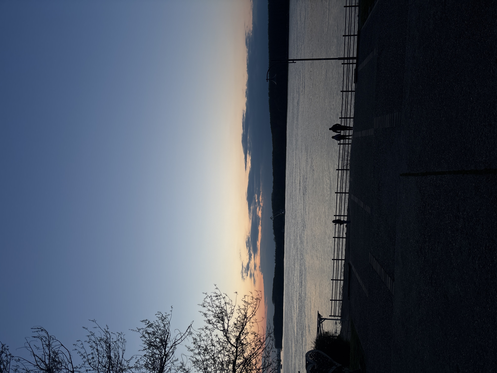The image depicts a dusk scene near the Danube River in Silistra, Bulgaria. In the foreground, silhouetted trees are visible. The sky transitions from blue to orange and purple hues. Along the riverbank, a metal railing is present, and two indistinct figures are standing near it. A lamp post and dark, dense vegetation add depth to the scene. A paved path runs alongside the railing, leading into a dark, shadowy area. The river reflects the colors of the sky.