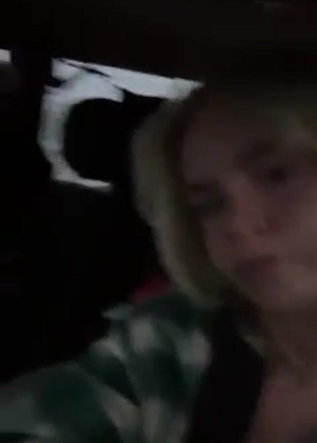 young woman with short blonde hair in the front passenger seat of a car. She is wearing a green and white plaid shirt and a seatbelt. The car appears to be in motion. Through the window, it looks like it may be raining. In the backseat, another person is visible wearing a dark hoodie, but their features are obscured by shadow. The camera moves slightly as the car moves.