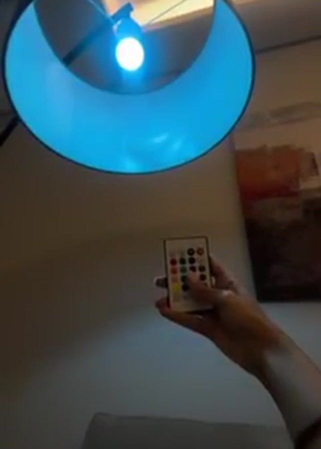 A person holds a remote control in front of a floor lamp, using the remote to change the lamp's light color. The lamp has a round black lampshade with a light-colored interior. The lamp is initially emitting a blue light, which the person changes to purple, then blue again, and then green. A painting hangs on the wall in the background. A couch is visible in the lower part of the frame.