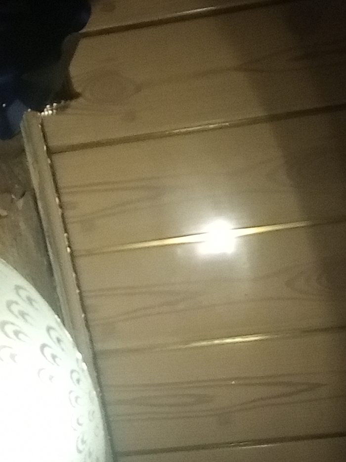 The image captures an indoor scene, likely a room in the city of Unknown, Unknown. The primary subject is a wall or ceiling constructed from light-colored horizontal wooden planks, exhibiting visible grain and thin dark joint lines. A bright, localized reflection from an unseen light source is prominent near the center-right of the wooden surface. In the lower-left quadrant, a portion of a curved white object with a repeating dark crescent-shaped pattern is visible. The upper-left corner shows a dark, amorphous shape. No individuals are present. No specific actions or interactions are depicted.