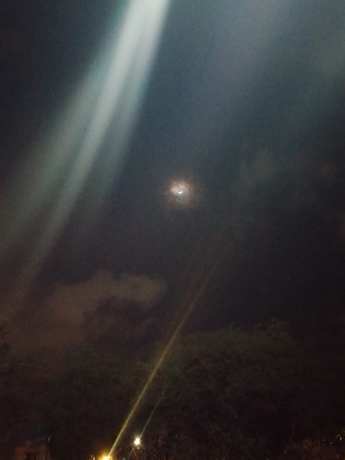 A crescent moon shines faintly in the night sky, partially obscured by thin clouds. A bright, diffuse beam of light extends from the upper left of the frame. Below, dark foliage suggests trees or bushes, with glimpses of building structures and streetlights at the bottom. A less distinct, narrow light streak cuts across the bottom portion of the image diagonally.