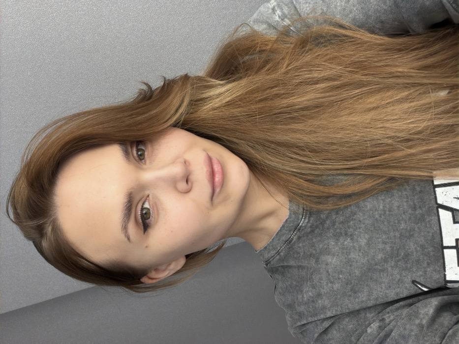 A close-up, waist-up portrait depicts a single adult female in an indoor setting, located in the city of Tyumen, Russia