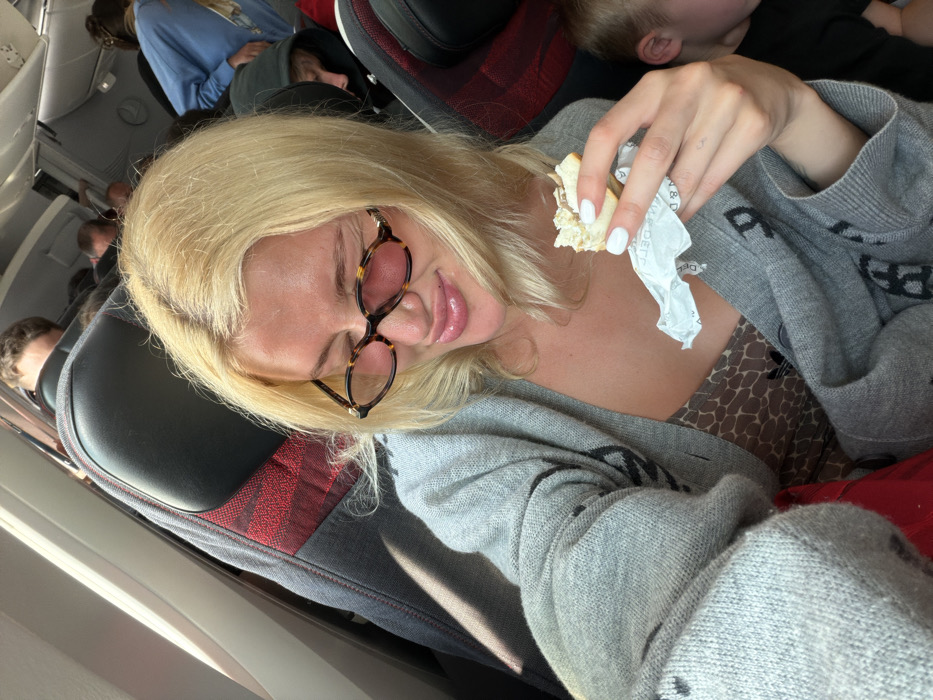 A blonde woman with glasses sits in an airplane seat, holding a partially eaten sandwich wrapped in paper. She wears a gray cardigan over a patterned shirt. The background shows other passengers, some sleeping. The image is taken at an angle, possibly a selfie. Sunlight streams in from a window. The seat has a red accent.