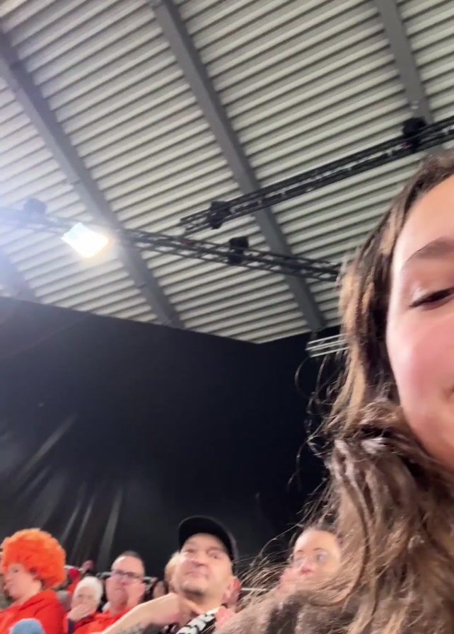 woman with long brown hair who appears to be recording herself in a crowded indoor space. The background shows spectators and event rigging under a high corrugated ceiling. The video then focuses on a person wearing a red beret and matching jacket, who is looking up at a large screen. The crowd is cheering. The video returns to the woman filming, who smiles.