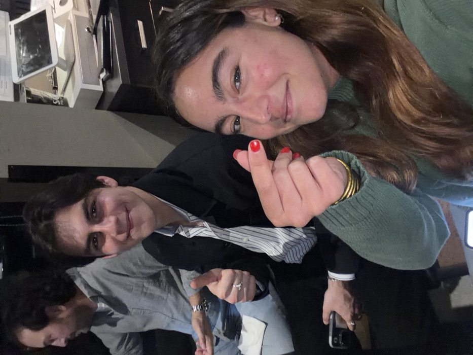 Two smiling individuals are in the foreground of the rotated image. The person on the right, a woman, has long brown hair, wears a green sweater, and makes a heart with her fingers. The person on the left, a man, wears a white and blue striped shirt and a black blazer. Two other people are visible in the background. A phone is held in a hand. A white table top, items and black cabinet are in the background.
