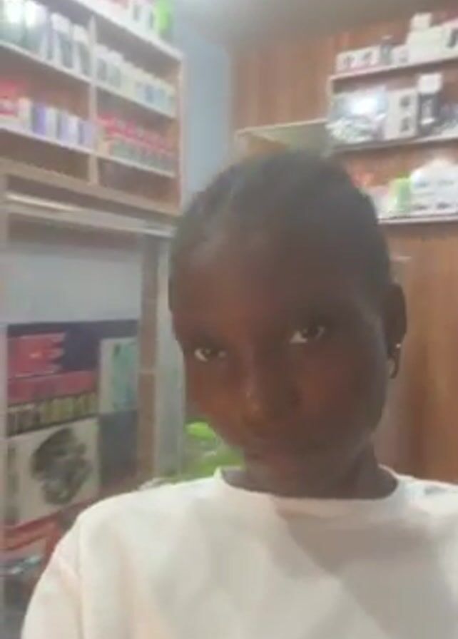 A person with braided hair and a white t-shirt is standing in a store. Shelves are filled with products behind them. The camera moves slightly.