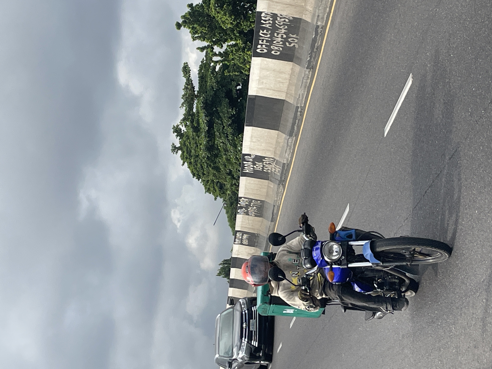 A person is seen operating a blue motorcycle on an asphalt road in Ikeja, Nigeria, under an overcast sky. The motorcyclist wears an orange-red full-face helmet with a dark visor, a light-colored hooded sweatshirt with dark markings on the front, dark gloves, dark trousers, and dark shoes. A large, rectangular, teal-colored delivery box is secured to the rear of the motorcycle. The motorcycle features a single round headlight and two rearview mirrors, and is moving towards the viewer. In an adjacent lane to the left and slightly behind the motorcycle, a black Toyota Highlander SUV is visible, moving away from the viewer. Its front license plate begins with "FJK". A concrete road barrier with alternating black and white vertical stripes runs along the right side of the road. White spray-painted text is visible on the barrier sections, reading "HOOK UP 150K 081516310" on one section, and "OFFICE ASSIST 08104546958 50K" on another. Behind the barrier, dense green trees are visible. The road surface features a yellow solid line next to the barrier and a white rectangular road marking in the foreground. The sky is uniformly covered with grey clouds.
