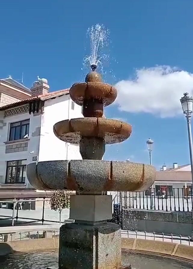 stone fountain with three tiers in a public space. The sky is blue with white clouds. Water shoots out from the top tier and cascades down to the second and third tiers, before collecting in the base of the fountain. A white building with brown trim is visible in the background, along with streetlights and black wrought iron railings. The fountain appears to be made of granite or a similar stone material. The water in the base of the fountain is rippling.