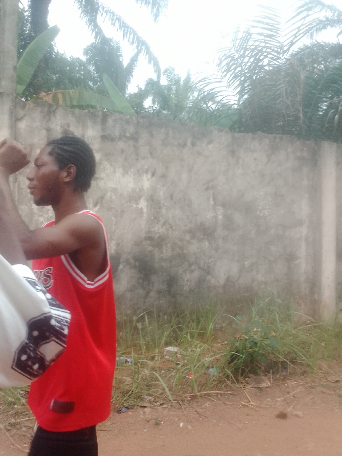 An individual in a red basketball jersey is seen outdoors. He has braided hair and is holding his fists near his face. Behind him, a textured concrete wall rises, with tropical foliage visible above it. The foreground includes grass and dirt, suggesting a roadside setting. The weather seems overcast. Part of a white object with dark detailing is visible to the left.