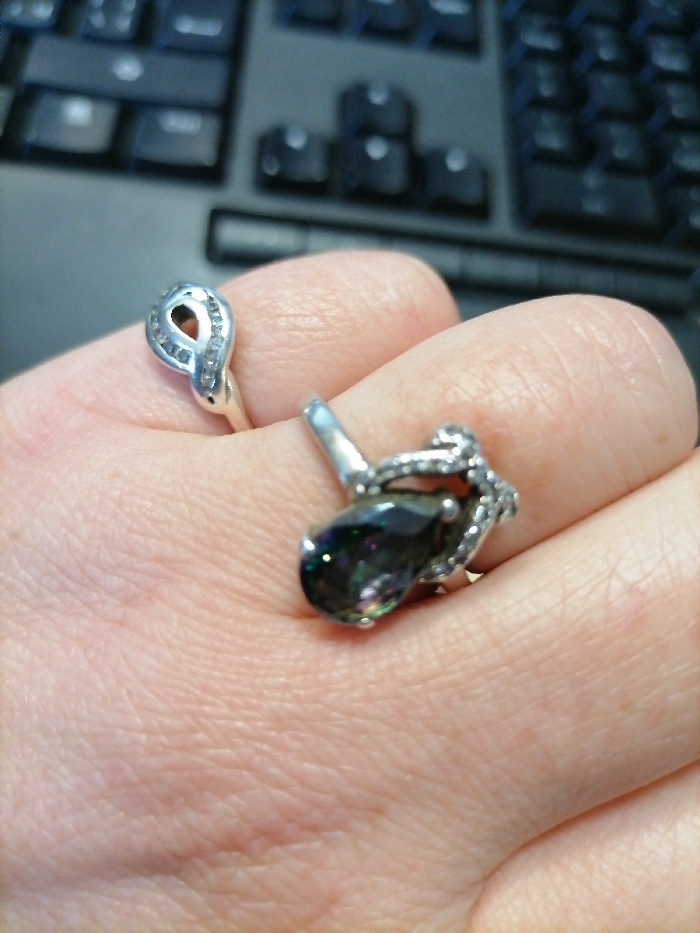 A close-up image displays the fingers of a light-skinned hand, likely an adult's, adorned with two rings. On one finger, a silver-toned ring features an elongated oval or infinity-loop design encrusted with small, clear stones. On an adjacent finger, a second silver-toned ring presents a prominent, teardrop-shaped gemstone exhibiting multicolored iridescence, set with prongs and surrounded by additional small stones or textured metalwork. The hand is positioned against an out-of-focus background revealing the dark keys of a computer keyboard. The environment is indoors. The location in Sofia, Bulgaria, is not discernible from the image content.