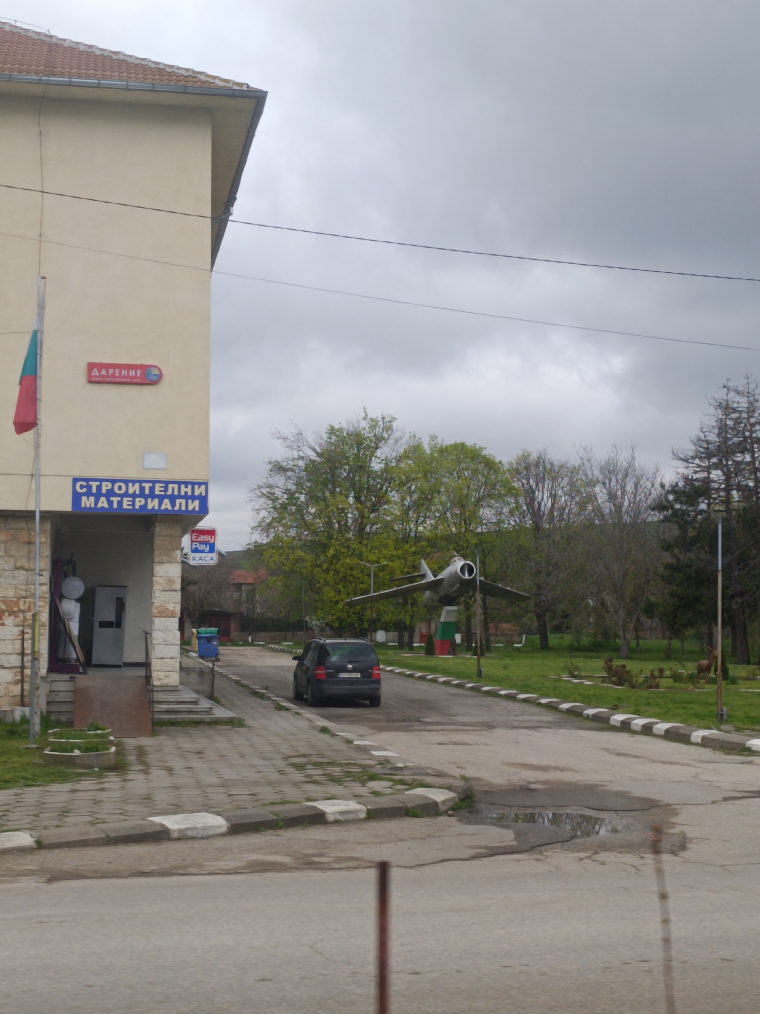 The image depicts a street scene in Komarevo, Bulgaria. A beige building with a red-tiled roof and signs in Bulgarian is on the left, one sign reads "СТРОИТЕЛНИ МАТЕРИАЛИ" which translates to “Building materials”. A Bulgarian flag hangs from the building. A dark grey Volkswagen car is driving on the road toward the center of the image. A decommissioned silver jet fighter plane is mounted on a pedestal in the middle ground, surrounded by grass and trees. The sky is overcast. The road is asphalt, with white and black painted curbs. A large puddle is visible in the road in the foreground.