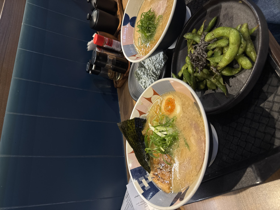 The image displays a meal set on a black, textured serving tray in an indoor restaurant. Two bowls of ramen are present, along with a plate of edamame and a small dish of nori seaweed. The larger ramen bowl, on the left, is white with blue and red geometric patterns, containing a rich, opaque broth, chashu pork, green onions, a halved soft-boiled egg with an orange yolk, and a large, triangular sheet of nori. The second ramen bowl, on the right and partially obscured, is dark-colored and also contains broth, noodles, and green onions. The edamame are served on a black, oval plate, topped with shredded dark seaweed. Behind the food, a wooden counter holds a condiment caddy containing two clear shakers (likely for oil and soy sauce), a red squeeze bottle, a metal shaker, a napkin holder, and two dark lidded containers. The background consists of a dark blue paneled wall topped by a light brown wooden ledge. A crumpled paper receipt with visible Thai script, including "บาท" (Baht) and "ภาษี" (tax), is on the far left. The scene is a prepared meal awaiting consumption at a ramen restaurant located in the city of Bangkok, Thailand. The precise location within Bangkok is not discernible.