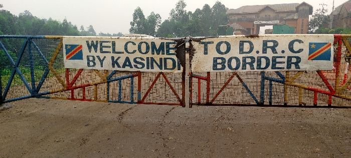 gate with two signs on it. The signs are white with black lettering. The left sign says "Welcome to D.R.C By Kasindi" and the right sign says "Border". Both signs have the flag of the Democratic Republic of Congo on them. The gate is made of metal and is painted blue, yellow, red, and white. The gate is open, revealing a dirt road. The background is a forest and a building. The location of the image is Unknown.
