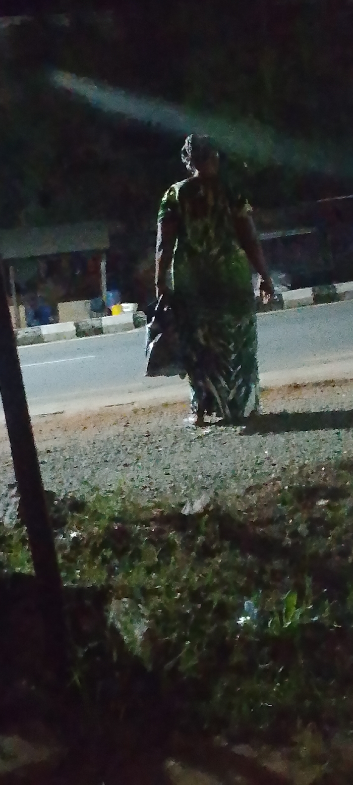 The image depicts a nighttime scene in Zango-ndaji, Nigeria. An adult individual, likely female, is observed walking on the gravelly shoulder adjacent to a paved road. The subject is oriented away from the camera, proceeding slightly right of the frame's center, wearing a long, patterned garment featuring green and lighter-colored designs, including a chevron-like pattern on the lower half. A dark bag or bundle is carried in the subject's left hand. To the right of the road, a white and black striped curb or barrier is visible. On the opposite side of the road, in the background, a structure resembling a market stall or small building is discernible, with various colorful objects, including blue and yellow items, present within or around it. The foreground includes sparse vegetation, primarily grass, and a dark, vertical object, possibly a pole or tree trunk, partially obscuring the lower left corner. The scene is illuminated by artificial light sources, casting some light on the subject's back and the road surface, indicating the dark conditions of night.