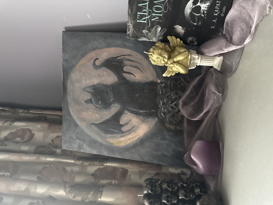 The image depicts an indoor still life arrangement in Petarch, Bulgaria. A rectangular canvas painting, approximately 50x40 cm, is positioned upright and slightly angled, serving as a central focal point. The painting features a black cat with bat-like wings and prominent green eyes, situated against a large, golden-orange full moon. The cat rests atop a dark mound composed of multiple human skulls, all set against a dark grey background. Arranged on a flat, light-colored surface in front of the painting are several items. From left to right, a black pillar candle molded into a stack of human skulls stands unlit. Adjacent to it is a small, irregular-shaped dark purple candle, also unlit. A length of translucent light purple-grey fabric is draped across the surface, weaving around the objects. Further right, a small, golden cherub bust candle with wings rests on a miniature white fluted pedestal; its wick is unlit. To the far right, a black paperback book stands upright, displaying Cyrillic text reading "КЪДЕ И МОЛЯ" by "Х. А. КАРАТ" with "ciela" as the publisher. The book cover features a skull and floral elements. The background consists of a patterned curtain on the left, displaying light brown and beige tones with a darker floral motif. The right side of the background reveals a plain light grey wall.