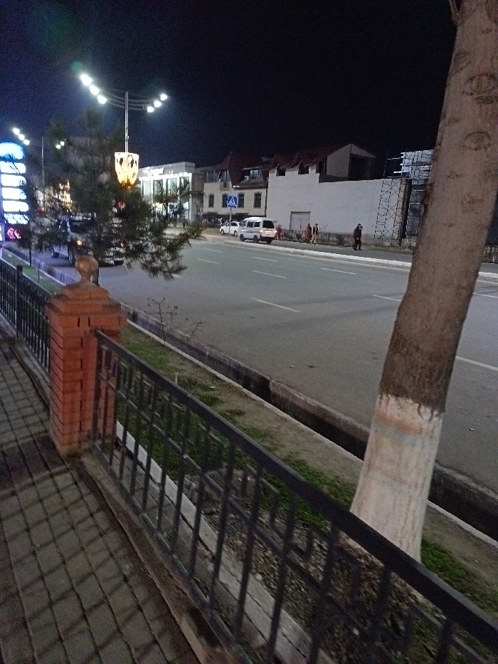 Nighttime urban scene featuring a street with sparse traffic and pedestrians. Streetlights illuminate the road and surrounding buildings. A tree trunk painted white at the base is prominent in the foreground. A black metal fence borders the sidewalk. Buildings are visible in the background, some with illuminated windows and distinctive architecture. The sky is dark.
