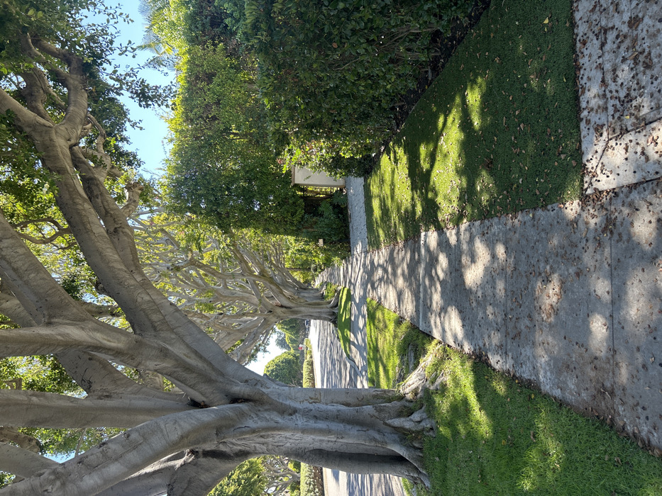 This image captures a wide-angle view of a tree-lined residential street and sidewalk in Beverly Hills, United States, under clear daylight conditions. The foreground is dominated by a concrete sidewalk stretching from the bottom right towards the upper center, partially obscured by shadows cast by overhead trees. The sidewalk surface shows scattered small, dark debris, likely fallen leaves or fruit. To the left of the sidewalk is a narrow strip of well-maintained green grass, followed by the large, light-grey trunk and expansive branches of a mature Ficus tree (likely Indian Laurel Fig or Moreton Bay Fig). Its robust roots are visible at the base, slightly lifting the surrounding grass. To the right of the sidewalk is another wider, neatly manicured lawn of green grass, also marked by tree shadows and some scattered debris. In the midground, a continuous row of similar Ficus trees lines the left side of the street, their light-grey trunks and dense green canopies forming an archway over the road and sidewalk. Their extensive branching patterns are clearly visible. The asphalt street beyond the trees appears clear of immediate traffic, though indistinct vehicle shapes are visible in the far distance. On the right side of the image, parallel to the sidewalk, is a tall, dense, and meticulously trimmed green hedge, obscuring any property details behind it. A light-colored, rectangular structure, possibly a gate pillar or a section of a wall, is partially visible within an opening in the hedge further down the path, suggesting an entrance to a property. The background reveals more residential landscaping and the continuation of the tree-lined street under a bright, clear blue sky. No individuals, animals, or specific actions are discernible within the frame. The scene is static, depicting an orderly urban environment.