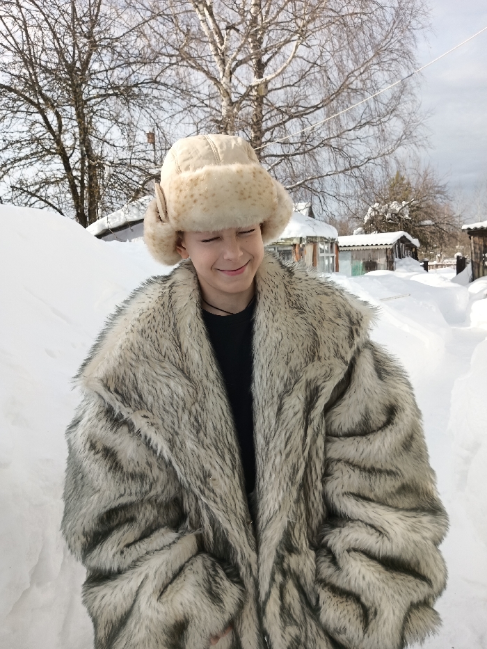 A young individual is depicted outdoors in a snowy, semi-rural setting within the city of Красный Маяк, Russia. The person, appearing to be a pre-teen or teenager, wears a cream-colored ushanka-style hat with a fur brim and earflaps, and an oversized faux fur coat with grey and white mottled fur over a black shirt, a thin black cord necklace visible. The individual stands facing the camera, smiling with closed eyes, indicating either bright light or contentment. The ground is heavily covered in deep snow drifts, with a cleared pathway visible extending into the background. Several bare deciduous trees with light-colored bark are prominent behind the individual. In the midground, various small, simple wooden structures, consistent with houses or outbuildings, are partially visible, some with snow-laden roofs. The sky above is overcast with patches of lighter sky.