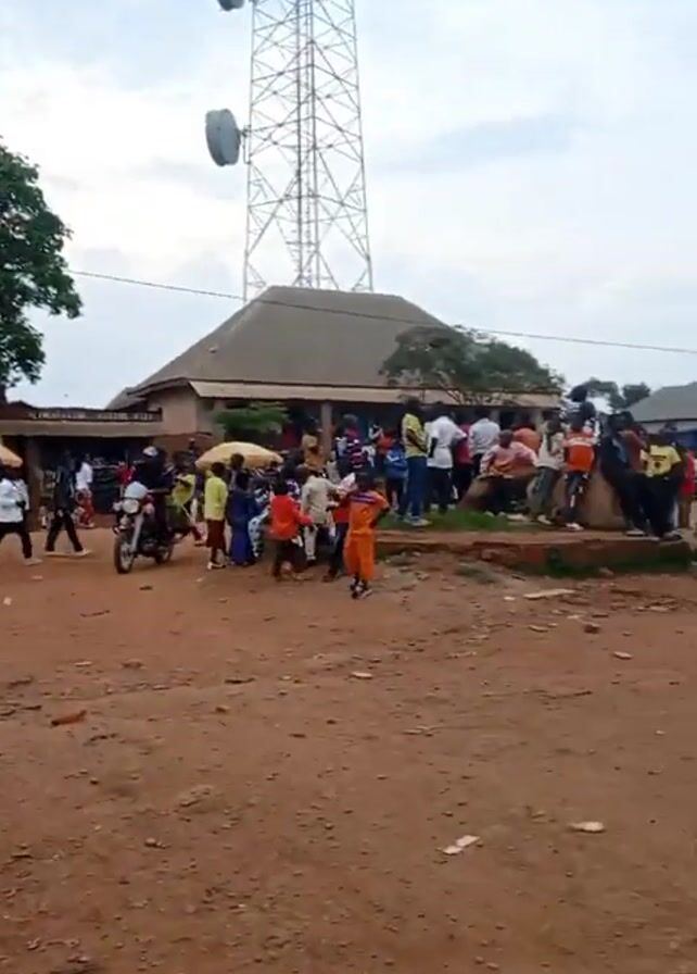dirt square or road in what appears to be a small town or village. Several buildings are visible around the square with various people moving about, some standing in groups, and others walking around. A few motorcycles are present, some parked and some moving through the area. One motorcycle has three people riding on it. A cell tower is also visible in the background. The sky is overcast. The overall activity level appears to be normal for a public area during the daytime.