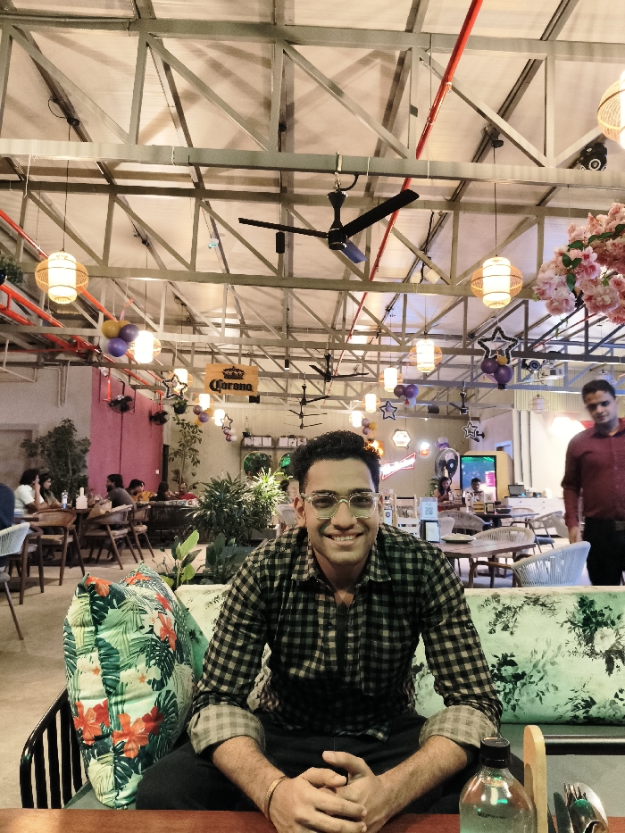 A young adult male, of apparent South Asian descent, with short dark curly hair and clear-framed glasses, is seated and smiling directly at the camera. He wears a dark plaid long-sleeved shirt with rolled-up sleeves and dark trousers, with his hands clasped on a dark wooden table in front of him. A clear bottle and a wooden condiment holder with cutlery are on the table to his right. He is positioned on a cushioned bench featuring a green and white floral pattern, with a tropical-themed pillow to his left. The scene is an indoor contemporary restaurant or bar in Bengaluru, India, characterized by a high, open ceiling with exposed metal truss work, numerous black ceiling fans, and red conduits. Various decorative hanging lamps (wicker-style, star-shaped) illuminate the space, alongside track lighting and neon signs, including a wooden "Corona" sign and a red "Budweiser" neon sign. Purple and yellow balloons are part of the decor. Potted green plants are strategically placed throughout the establishment. On the left side of the midground, a prominent pink wall section is visible. Seating arrangements include wooden tables with chairs and additional cushioned benches. In the background, multiple patrons are visible at tables, and a man in a maroon long-sleeved shirt and dark trousers stands on the right, facing away from the camera, possibly a staff member. A blurred television screen is also visible in the background.