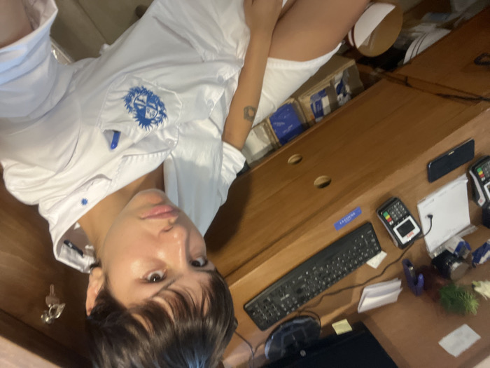 A person in a white shirt, possibly an employee, looks at the camera near a wooden desk. The desk has a keyboard, two payment terminals, a smartphone, a mouse, and some office supplies. A roll of bubble wrap, cardboard box, and white bowl are behind the desk. Keys are to the left of the person. A tattoo is visible on their arm. The image is slightly rotated.