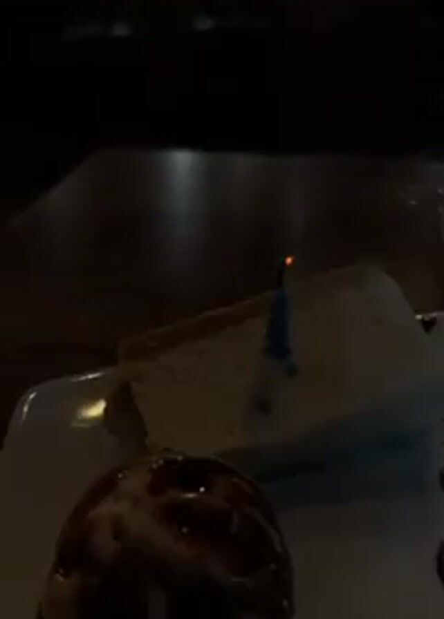 A close-up shot shows a slice of cheesecake on a white plate, accompanied by a scoop of ice cream covered in chocolate sauce. A small, blue birthday candle is stuck in the cheesecake, with a bright flame. The candle is then blown out, and smoke rises from the extinguished wick. The plate sits on a dark wooden table in what appears to be a restaurant or bar setting, with blurred background elements suggesting other tables, people, and a television screen.